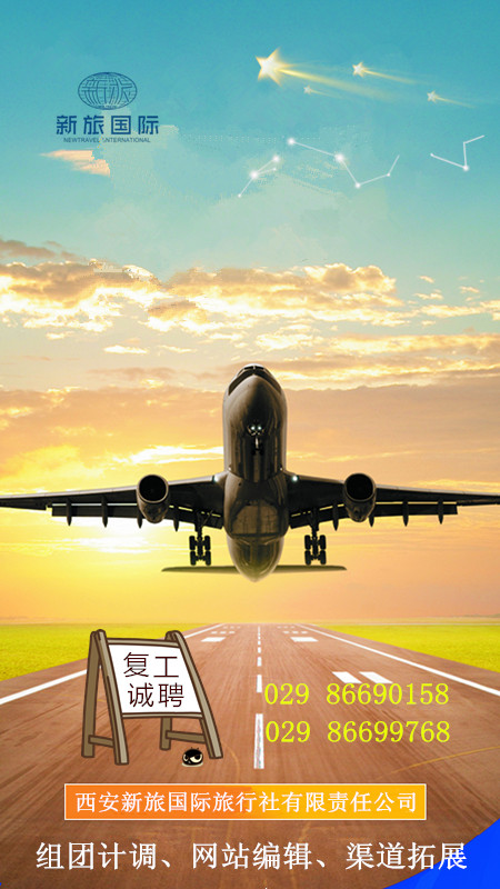 西安新旅國旅總社招聘:渠道拓展專員歡迎各位有志于旅游業(yè)的人士加入西安新旅國際旅行社有限責任公司,攜手共進,共謀發(fā)展!